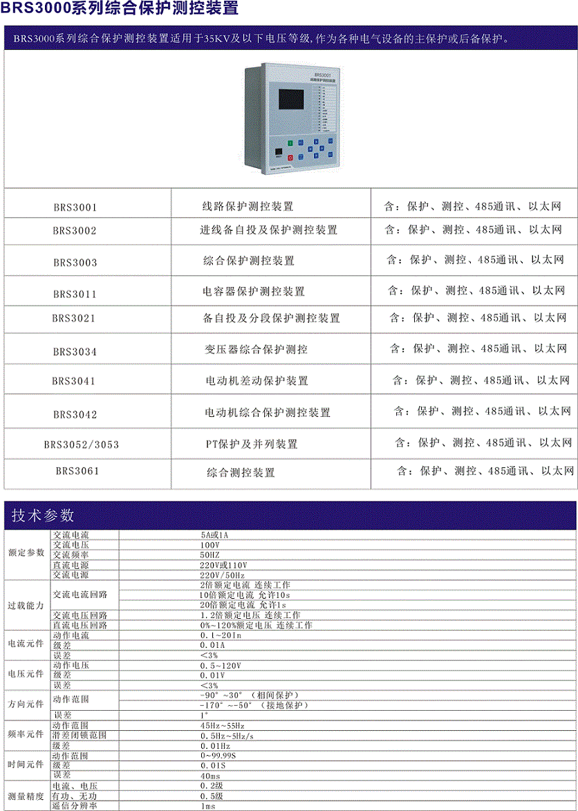 BRS3000系列保護(hù)測(cè)控裝置是在多年實(shí)踐應(yīng)用和運(yùn)行經(jīng)驗(yàn)的基礎(chǔ)上,吸取了國(guó)內(nèi)外微機(jī)保護(hù)裝置現(xiàn)有的先進(jìn)技術(shù),研制推出的新一代微機(jī)保護(hù)測(cè)控裝置。廣泛適用于電力、水利、石油、化工等行業(yè)35KV及以下電壓等級(jí)系統(tǒng),作為各種電氣設(shè)備的主保護(hù)或后備保護(hù)。